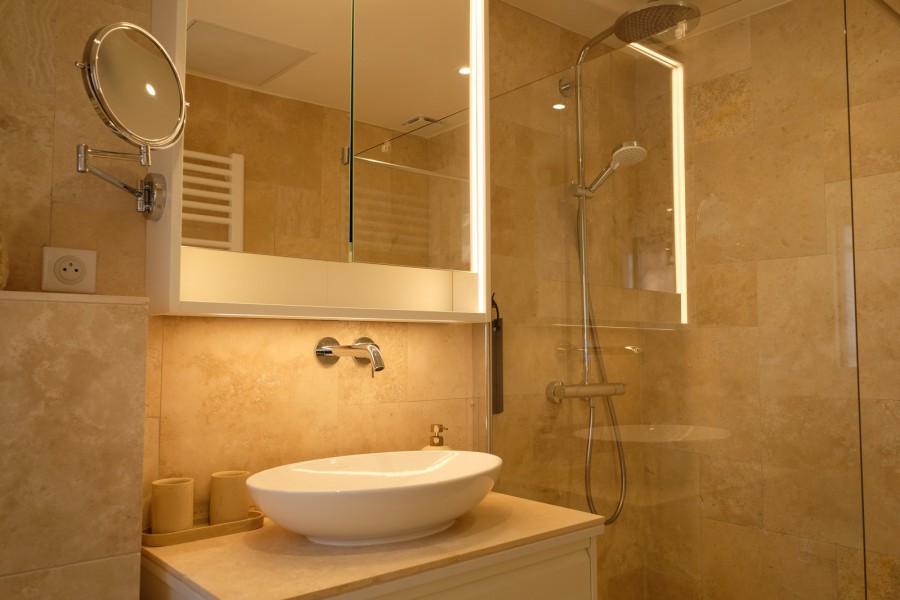 In Schlafzimmer 1 und Schlafzimmer 2 steht jeweils ein Doppelbett (160x200). Das Badezimmer ist modern und luxuriös ausgestattet und verfügt über ein Waschbecken, Dusche und Toilette.