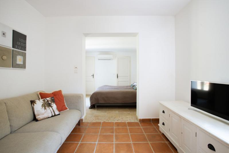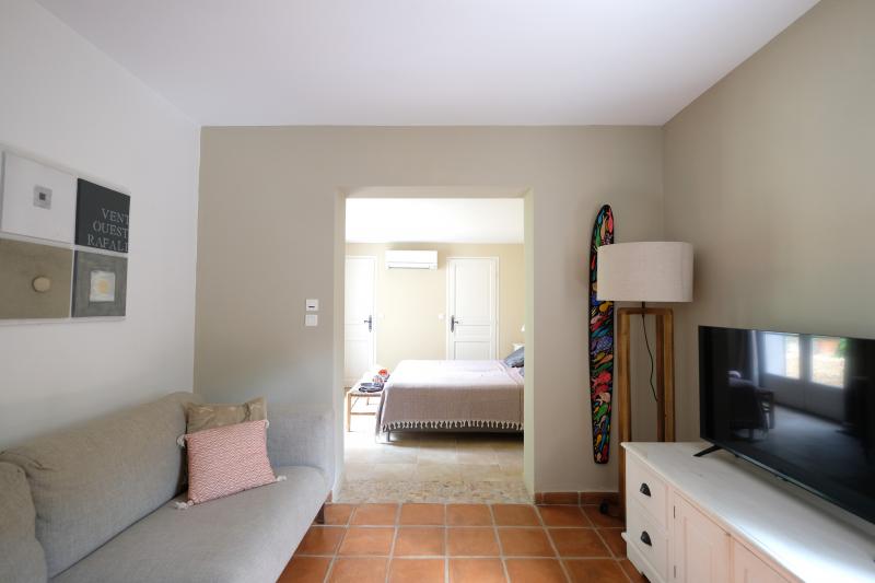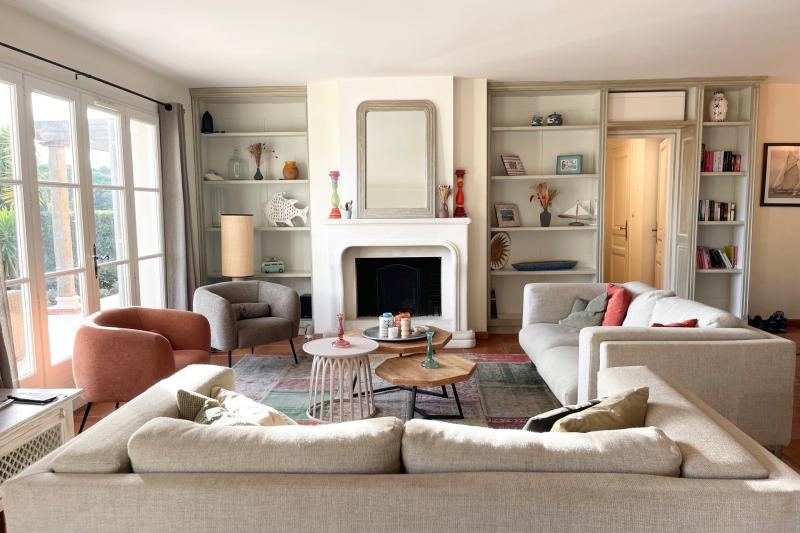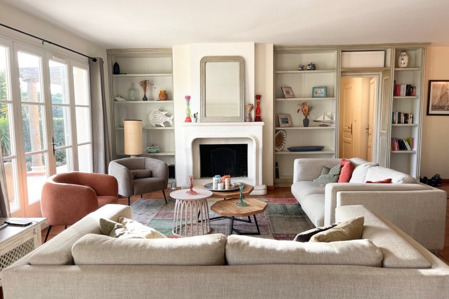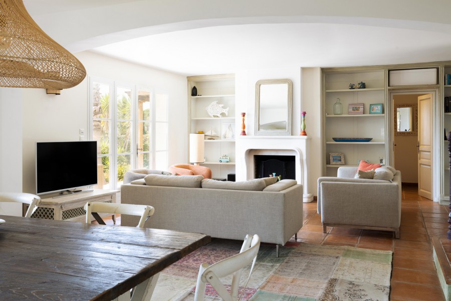 Vom Wohnzimmer aus haben Sie einen schönen Blick auf den großzügigen Garten, den Pool und den Golf von Saint Tropez. Das Wohnzimmer und die Küche haben Zugang zur überdachten Terrasse auf der Gartenseite der Villa.