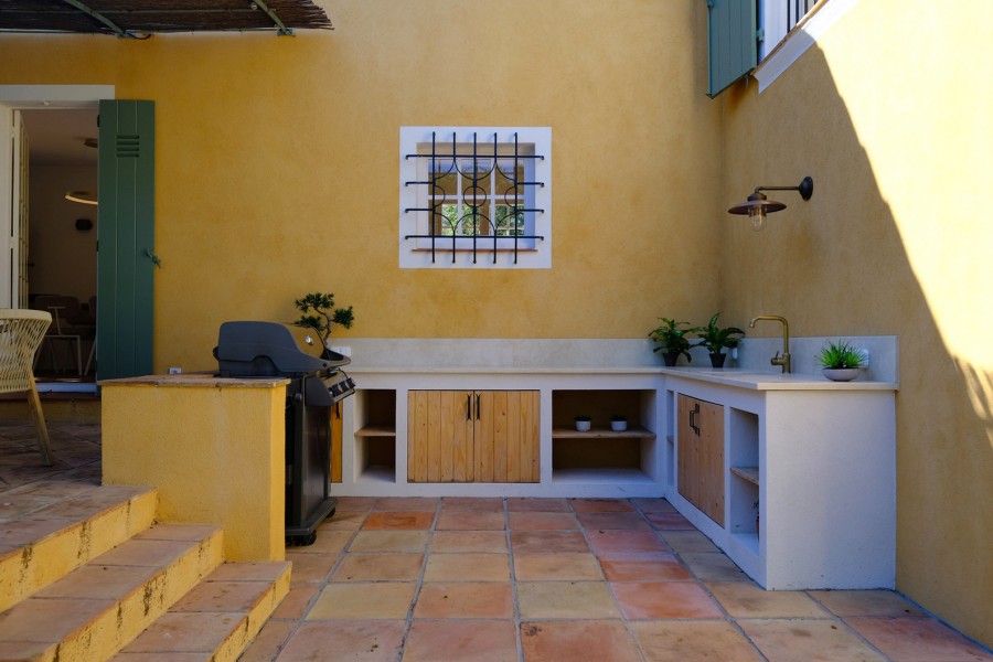 Auf der anderen Seite der Küche befindet sich eine stimmungsvolle BBQ-Terrasse mit Pergola – perfekt für laue Sommerabende und ein authentisches In- & Outdoor-Leben. In der angrenzenden Hauswirtschaftsküche steht zudem ein zusätzlicher Kühl- und Gefrierschrank zur Verfügung.