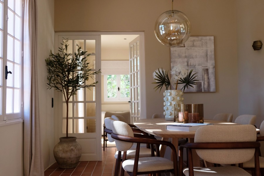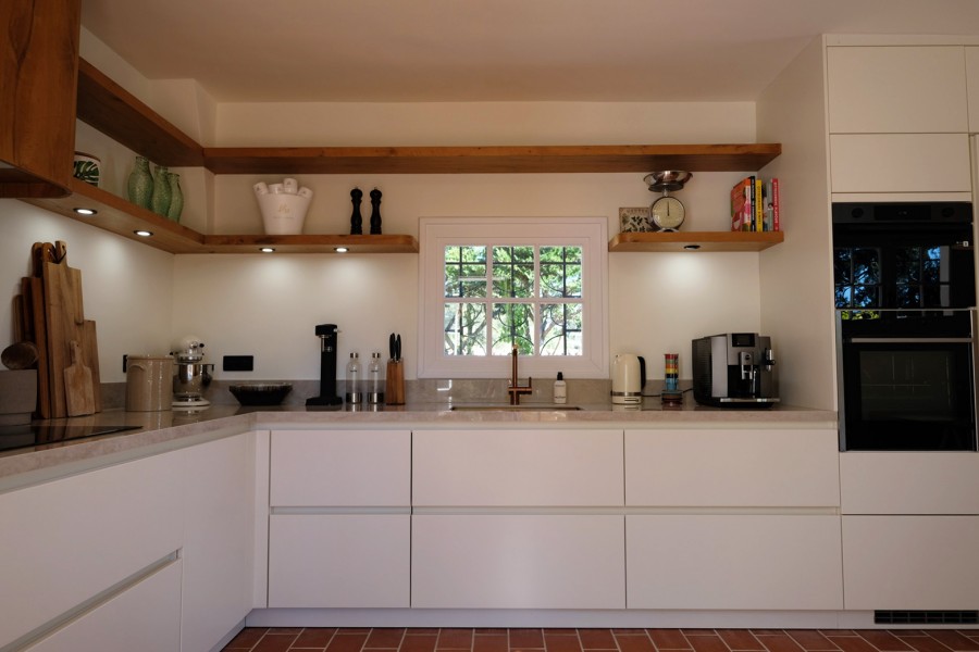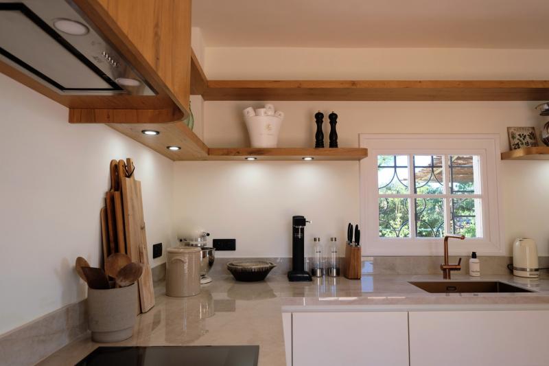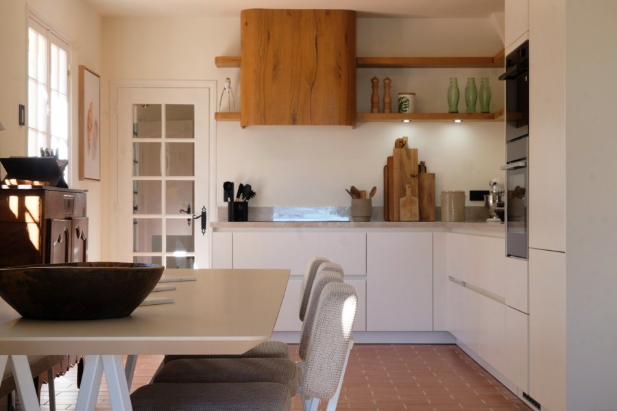 Das großzügige Wohnküchenkonzept bildet das Herzstück der Villa. Hier stehen Ihnen ein moderner Esstisch für acht Personen sowie moderne Küchengeräte zur Verfügung – darunter eine vollautomatische Jura E8-Kaffeemaschine. Durch elegante Flügeltüren öffnet sich die Küche direkt zum Garten und Poolbereich.