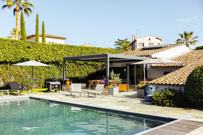 Die Küche bietet durch Doppeltüren Zugang zur (teilweise) überdachten Terrasse. Sobald Sie draußen stehen, blicken Sie auf den schönen Garten und die dahinter liegenden provenzalischen Hügel. Auf der Terrasse befindet sich ein Esstisch für 6 Personen, ein wunderbarer Ort, um außerhalb der Sonne zu sitzen und das Frühstück, Mittagessen oder Abendessen zu genießen. Nicht zu verpassen ist die gut ausgestattete Außenküche mit Herd (1 Gasbrenner), Plancha, Kohlegrill und Kühlschrank für ein schönes Erfrischungsgetränk.