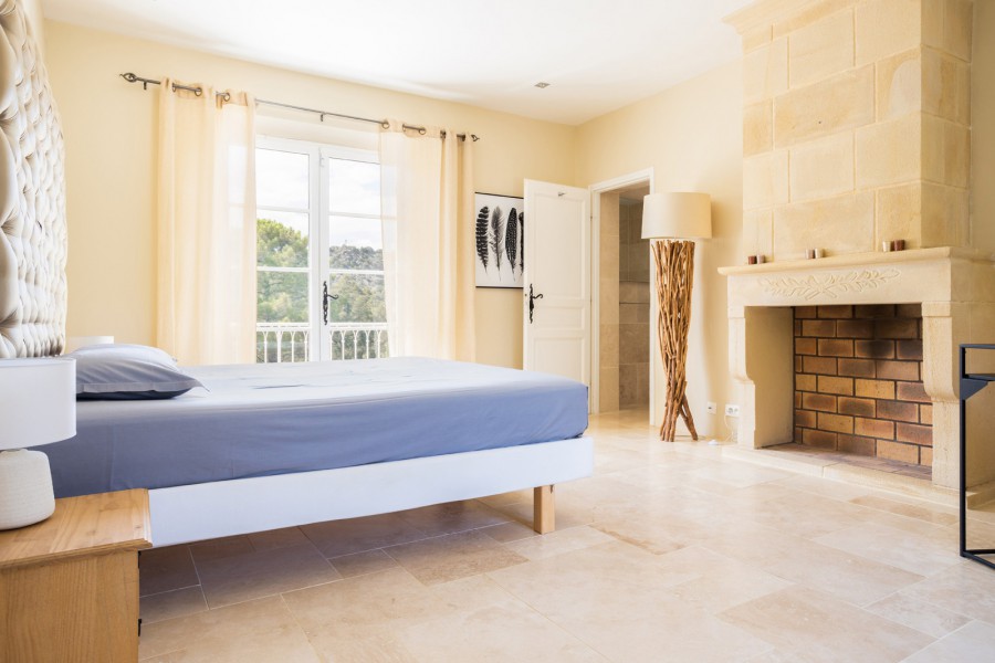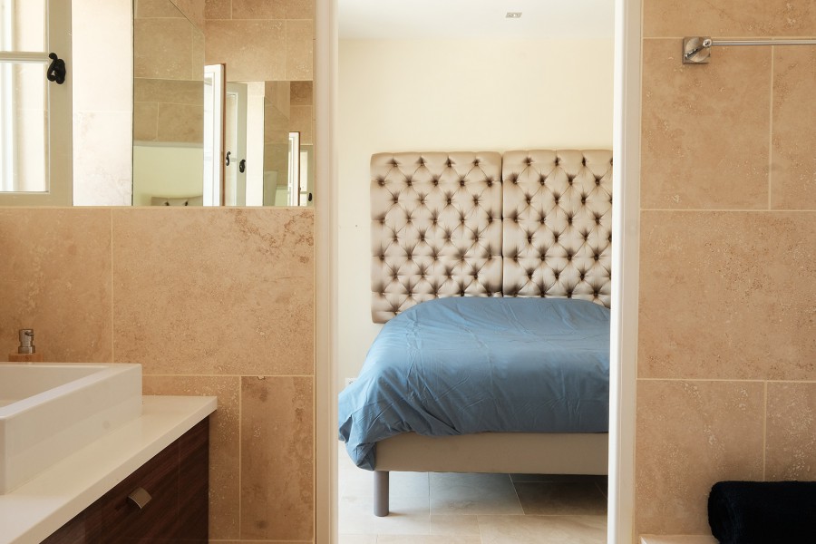 Schlafzimmer 3, rechts von der großen Treppe gelegen, bietet ebenfalls ein Doppelbett (180x200) und teilt sich ein Badezimmer (Dusche/Badewanne und Waschbecken) mit einem Kinderzimmer mit 2 Betten von 140x200. Die Schlafzimmer 3 und 4 bieten Türen zu einer großen Terrasse mit Blick auf den Pool.