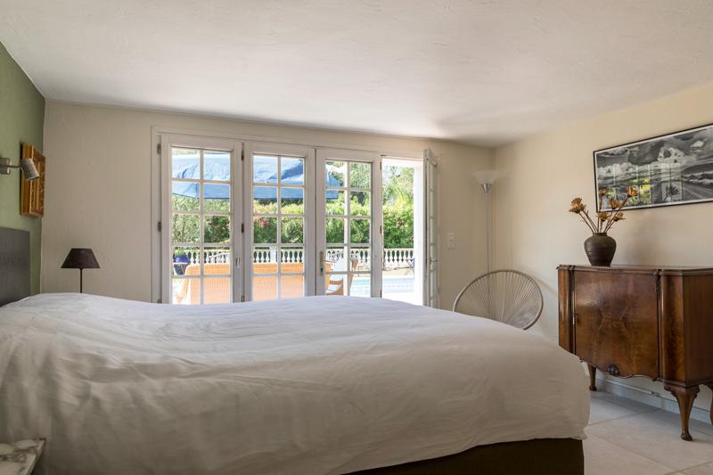 Es gibt insgesamt 4 Schlafzimmer. 3 Schlafzimmer im Erdgeschoss und 1 Schlafzimmer auf der ersten Etage. Alle Schlafzimmer verfügen über eine Klimaanlage. Das Master-Schlafzimmer, Schlafzimmer 1 befindet sich im Erdgeschoss. Hier steht ein Doppelbett (190x210). Das Master-Schlafzimmer bietet über aufschlagende Türen Zugang zum Garten und verfügt über ein eigenes Badezimmer (Dusche, Waschbecken und WC). Schlafzimmer 2 verfügt zwei getrennte Betten (90x200) sowie aufschlagende Türen zu der Terrasse. Schlafzimmer 3 kann über das Fernsehzimmer im Erdgeschoss erreicht werden. Hier steht auch ein Doppelbett (180x200). Schlafzimmer 2 und 3 teilen ein Badezimmer (Badewanne, Dusche und WC). Schlafzimmer 4 befindet sich auf der ersten Etage. Auch in diesem Schlafzimmer steht ein Doppelbett (160x200). Schlafzimmer 4 verfügt über ein eigenes Badezimmer (Dusche und Waschbecken).