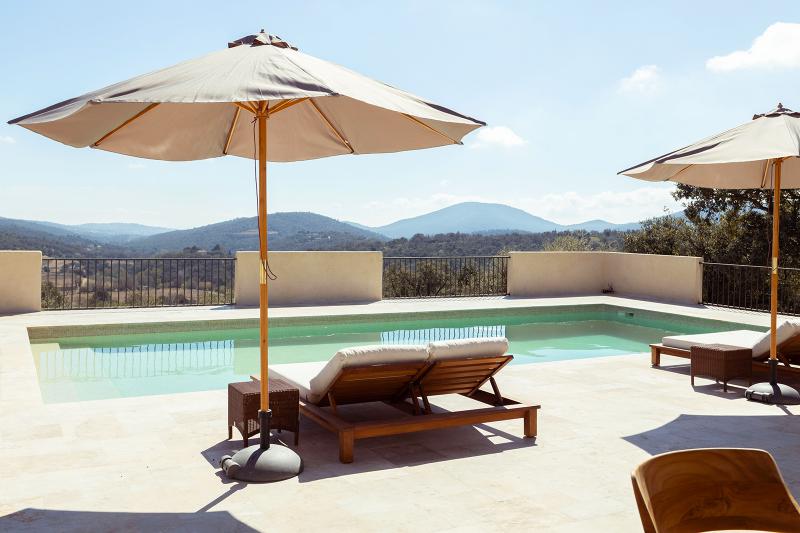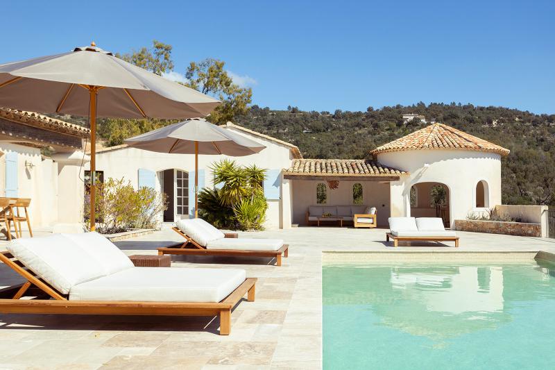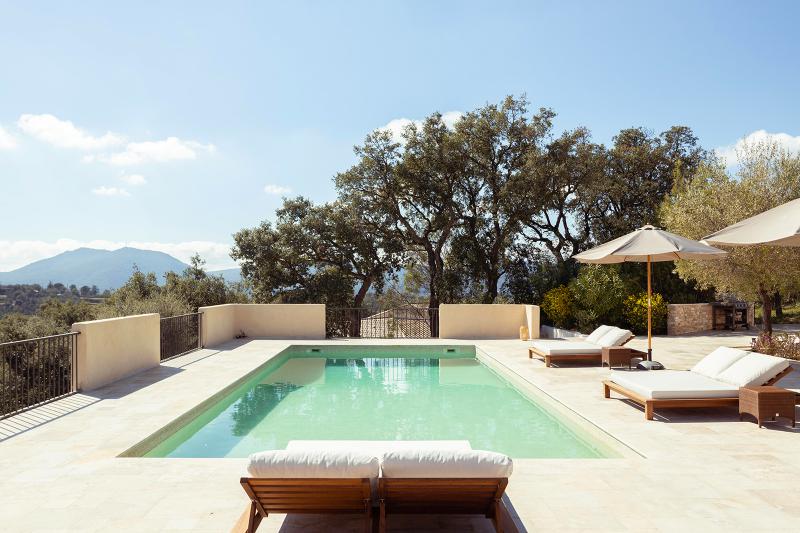 Das Wohnzimmer ist modern und luxuriös eingerichtet mit mehreren schönen Sitzgelegenheiten. Es gibt einen Kamin, der in der Vor- und Nachsaison sehr angenehm zu nutzen ist. Vom Wohnzimmer aus haben Sie einen schönen Blick über die Terrasse und den Swimmingpool, in Richtung Mittelmeer.