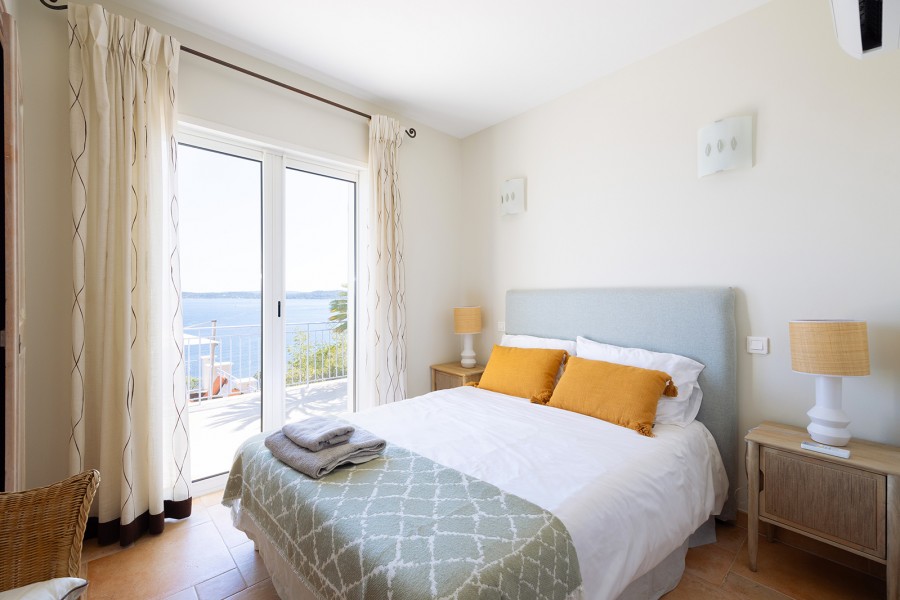 Auf der 1. Etage: Schlafzimmer 1 ist ein geräumiges Elternschlafzimmer mit einem Doppelbett (2x90x200), einem modernen Badezimmer (Dusche und WC) und einer herrlichen privaten Terrasse mit fantastischem Meerblick.