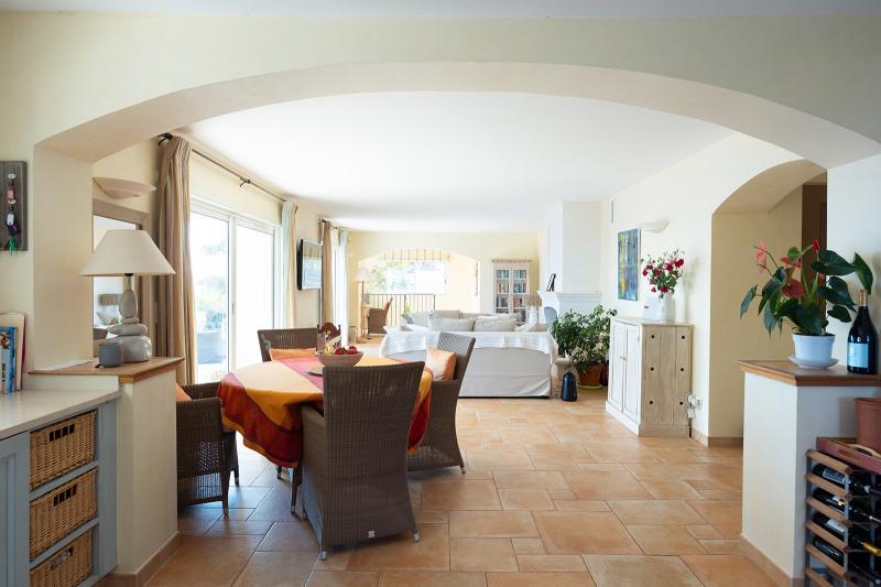 Der Wohnbereich besteht aus einer Sitzecke mit bequemen Sofas und verschiedenen Sesseln, einem großzügigen Essbereich und einer großen offenen Küche. Große Glastüren bieten direkten Zugang zur XL-Terrasse. Die voll ausgestattete Küche bietet allen Komfort, einschließlich einem großen Backofen, Mikrowelle, amerikanischem Kühlschrank, Wasserkocher, Kaffeefiltermaschine und separatem zweiten Kühlschrank. WLAN ist vorhanden.