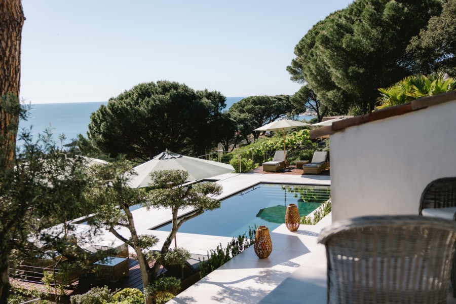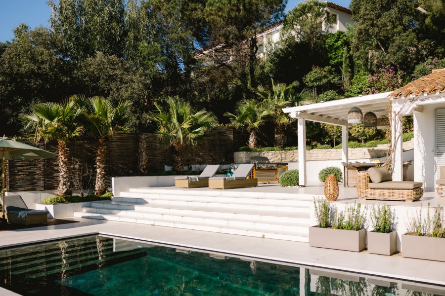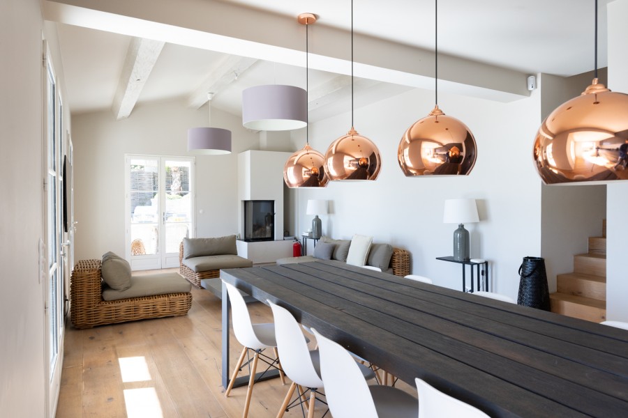 Der Wohnbereich ist modern eingerichtet. Die Möbel sind so platziert, dass Sie das Panorama auf das Mittelmeer in vollen Zügen genießen können. Die offene Küche ist modern und mit hochwertigen Geräten ausgestattet. Oft ist das Äußere eine Verlängerung des Innenbereichs – bei dieser Villa ist es umgekehrt. Der Stil der Gartenmöbel auf der großzügigen Terrasse findet sich auch im Wohnzimmer wieder. Das verleiht der Villa einen stilvollen Beach-Look.