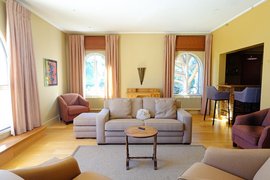 Durch die charakteristische Haustür betreten Sie den geräumigen Flur dieser beeindruckenden Villa. Es gibt ein geräumiges Wohnzimmer von 100m² mit sehr komfortablen Sitzmöbeln, TV (mit Satellit) und Sonos Musikanlage. In der Villa befindet sich auch ein zweiter kleinerer (30 m²) Salon mit Bar. Außerdem gibt es ein Esszimmer mit Esstisch für 12 Personen. Zudem gibt es einen Abstellraum mit Waschmaschine und eine Garage für 4 Autos.