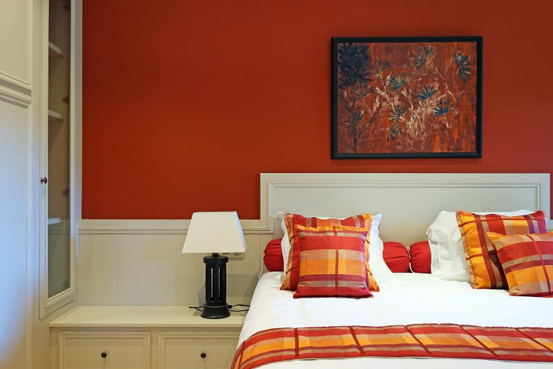 In dieser Villa finden Sie insgesamt 8 geräumige Schlafzimmer und 8 Badezimmer. Es gibt 4 Schlafzimmer auf der Ebene des Wohnzimmers und 4 Schlafzimmer eine Etage tiefer. Die Schlafzimmer auf der Ebene des Wohnzimmers sind klimatisiert. Schlafzimmer 1 ist das Master-Schlafzimmer (35 m²) mit Doppelbett (180x200), Sitzecke und en-suite Badezimmer mit Badewanne, Dusche und separatem WC.