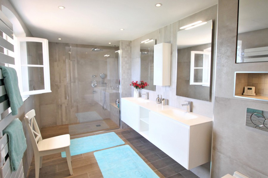 Es gibt insgesamt 5 Schlafzimmer, die alle klimatisiert sind und jeweils ein eigenes Badezimmer haben. Im Erdgeschoss gibt es 4 Schlafzimmer und 4 Badezimmer. Im ersten Stock gibt es ein großes Elternschlafzimmer mit eigenem Badezimmer.