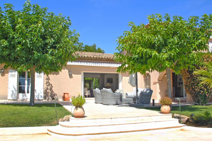 Dies ist eine wundervolle Villa mit allem Komfort. Das Wohnzimmer bietet auf der gesamten Seite einen Panoramablick auf den Golf von Saint Tropez und das Mittelmeer. Es verfügt über eine sehr komfortable Sitzgruppe. Besonders schön sind die großen Schiebetüren auf beiden Seiten des Wohnzimmers, die den Innen- und Außenbereich nahtlos miteinander verbinden.