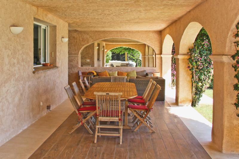 Die Terrasse ist teilweise überdacht, was sehr angenehm für Schatten sorgt. Dort steht ein Esstisch und eine bequeme Lounge-Sitzgruppe. Hier können Sie die wunderschöne Aussicht auf das Meer genießen.