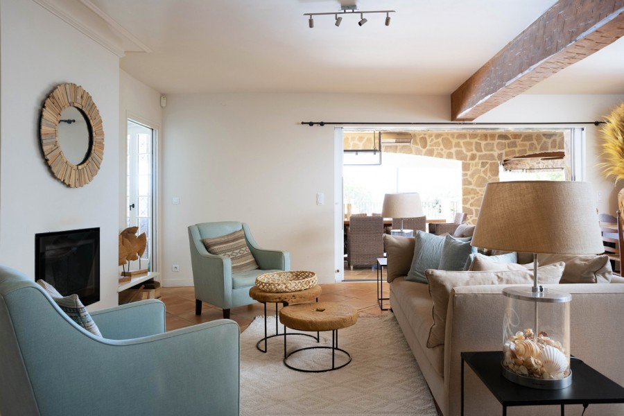 Das Wohnzimmer, die Küche und das 5. Schlafzimmer befinden sich eine Etage tiefer, die über eine breite Treppe zu erreichen ist. Das Wohnzimmer ist geräumig und befindet sich auf der Ebene des Pools. In der Verlängerung des komfortabel eingerichteten Wohnzimmers befindet sich das Fernsehzimmer. Hier gibt es eine gemütliche Sitzecke und natürlich fehlt auch ein großer LCD-Fernseher nicht. Die offene Küche ist geräumig und gut ausgestattet unter anderem mit einem amerikanischen Kühlschrank, Ofen und Mikrowelle.