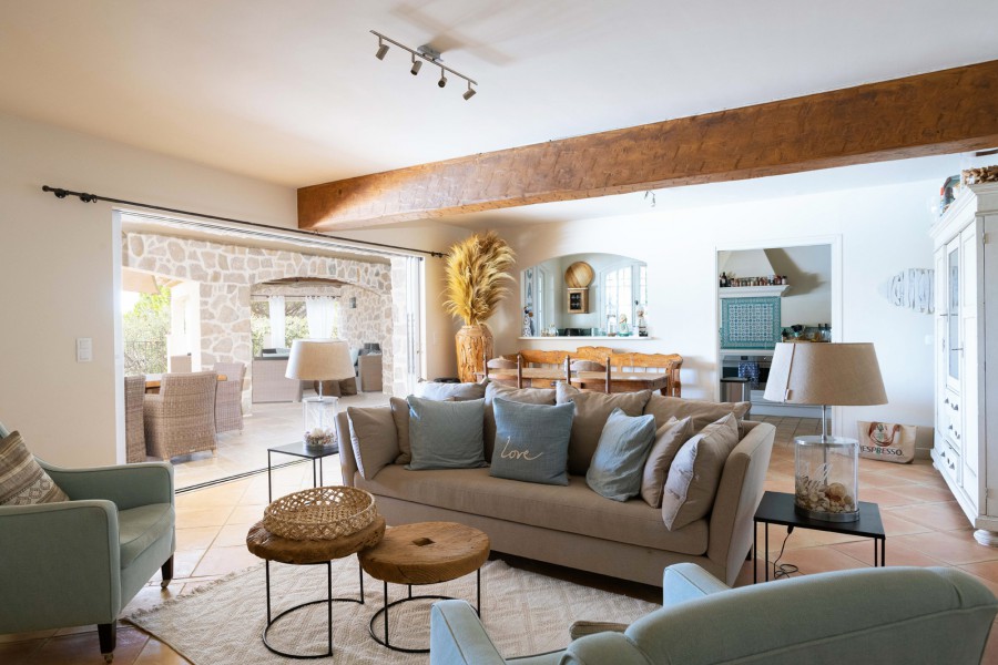 Die Küche bietet direkten Zugang zu der überdachten Terrasse. Auch von dem Wohnzimmer aus ist die geräumige Terrasse einfach zu erreichen. Die großen Glas-Schiebetüren verschwinden komplett in der Wand, sodass der Außenbereich mit dem großen Lounge-Set und Esstisch, fast Eins wird mit dem Innenraum.