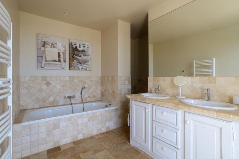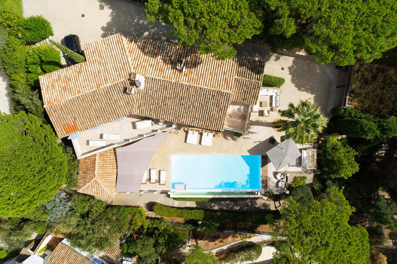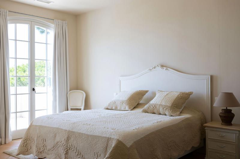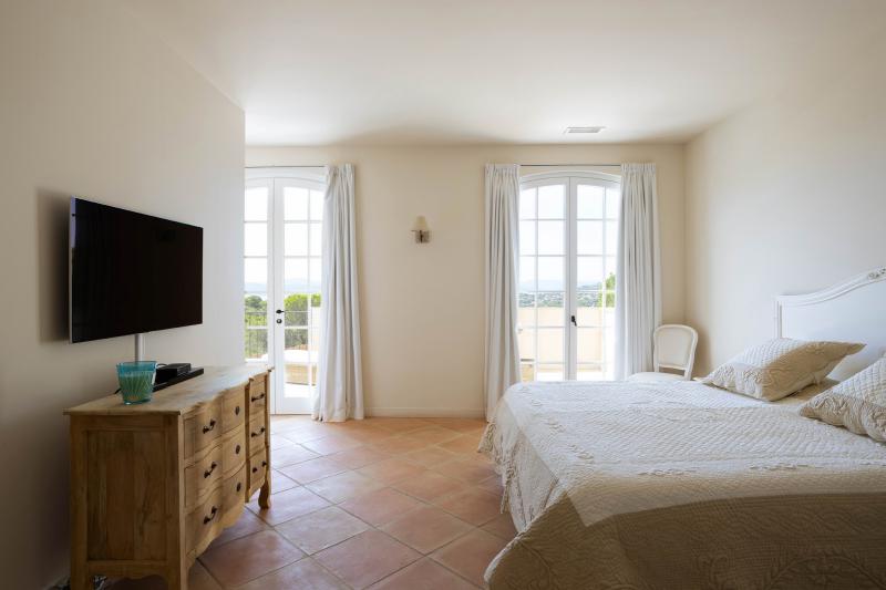 1. Etage: Schlafzimmer 1 ist das Master-Schlafzimmer und gleichzeitig auch das Geräumigste. Dieses Schlafzimmer bietet neben einem en-suite Badezimmer (Dusche, Badewanne, doppelte Waschbecken und WC) auch Zugang zu der Terrasse von dem aus man eine schöne Aussicht auf Saint Tropez hat. Hier steht ein Doppelbett (180x200). Schlafzimmer 2 ist weniger geräumig aber auch hier steht ein Doppelbett (2x90x200). Das Badezimmer ist en-suite (Dusche und WC).