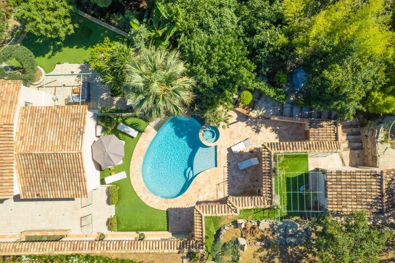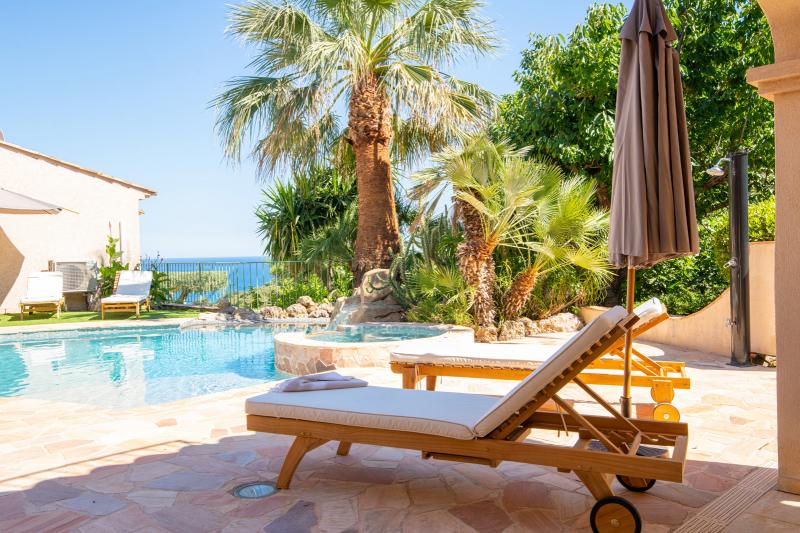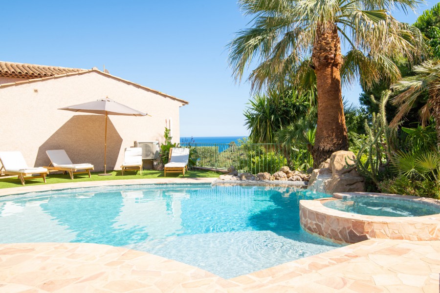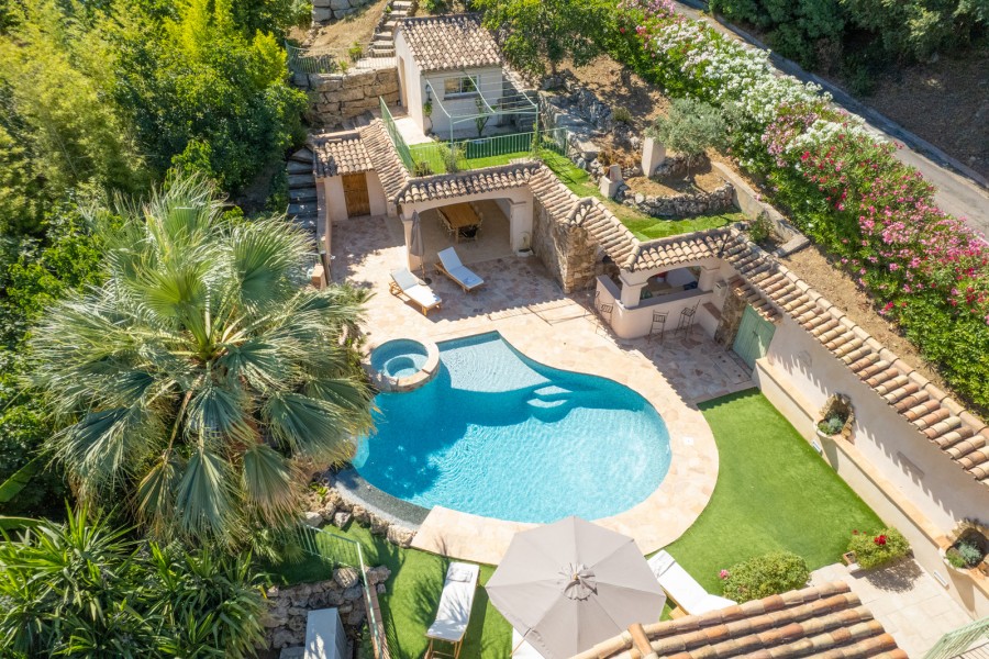 Schlafzimmer 3 und 4 verfügen jeweils über ein Doppelbett (160x200) sowie ein eigenes Badezimmer (Waschbecken und Dusche). Alle drei Schlafzimmer haben Zugang zu einer Terrasse, dem Garten und dem höher gelegenen Pool durch Terrassentüren.