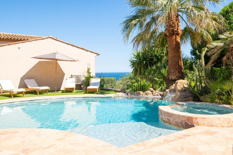 Schlafzimmer 1 befindet sich auf der Ebene des Wohnzimmers. Es ist mit einem Doppelbett (160x200) ausgestattet und verfügt über ein privates Badezimmer (Dusche und separates WC). Ein französischer Balkon mit Blick auf das Mittelmeer ist ein charmantes Extra.
