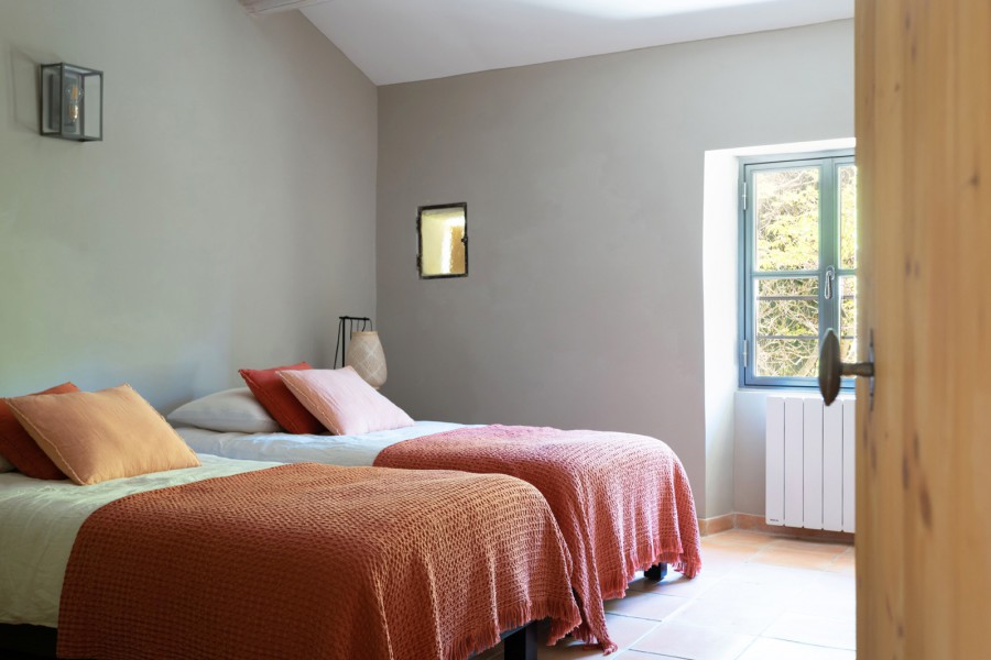 Schlafzimmer 1 ist mit einem Doppelbett (180x200), Fußbodenkühlung und einem eigenen Bad (Waschbecken, Dusche und separates WC) ausgestattet. Schlafzimmer 2 verfügt über ein Doppelbett (2x90x200), Fußbodenkühlung und ein eigenes Bad (Waschbecken und Dusche).