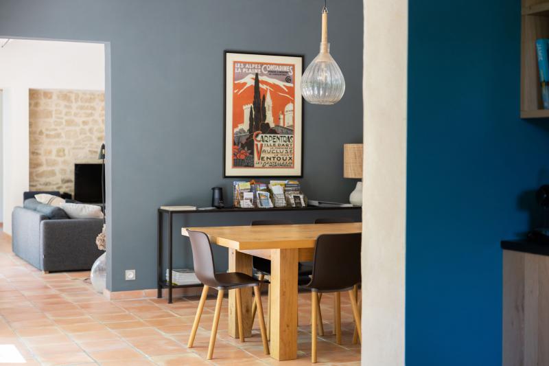 Angrenzend an das zeitgemäß eingerichtete Wohnzimmer finden Sie das Esszimmer, dahinter befindet sich die neue moderne Küche. Abgesehen von allem Komfort sind wir von der frischen Farbgestaltung in dieser Villa sehr angetan.