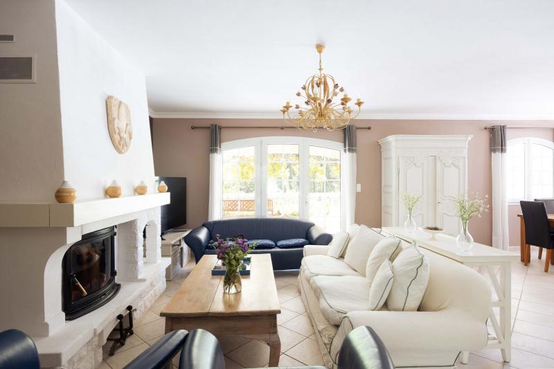 Dreigeschossiges provenzalisches Landhaus mit seinem Wohnbereich in der ersten Etage. Die Villa ist komplett mit Klimaanlage ausgestattet. Das geräumige Wohnzimmer ist komfortabel eingerichtet mit einer großen Sitzecke und einem Flachbildfernseher. Angrenzend an die Küche (Kühlschrank mit Gefrierfach, Mikrowelle, 1 separater Gefrierschrank und Geschirrspüler) befindet sich eine große Terrasse mit einem XL-Esstisch und Sommer-/Außenküche. In der ersten Etage befindet sich ein geräumiges Esszimmer mit einem großen Esstisch (8 bis 12 Personen), einem Flachbildschirm-TV und einem Klavier.
