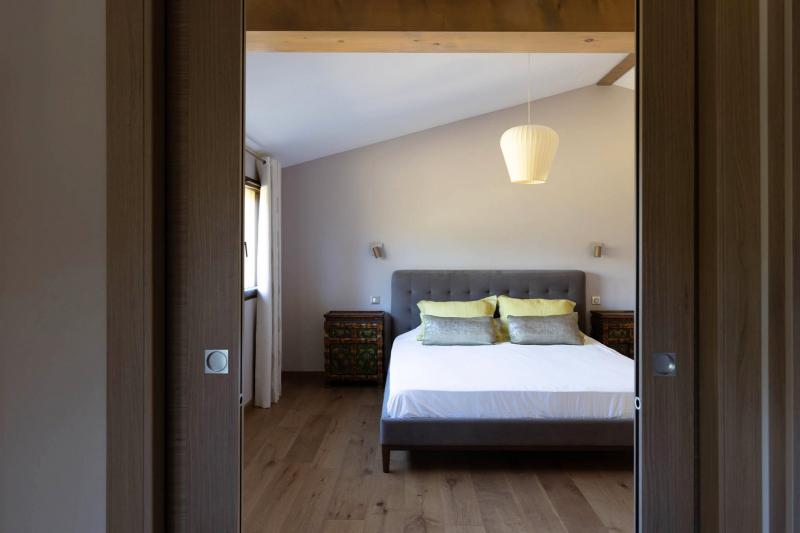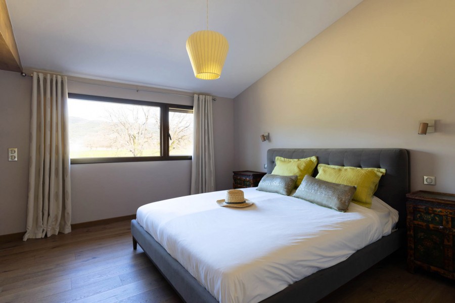 Schlafzimmer 1 ist die Hauptsuite im 1. Stock des modernen Anbaus. Das Doppelbett misst 180 × 200 cm. Die Suite bietet einen großzügigen Ankleidebereich, und das luxuriöse Badezimmer ist mit einer stilvollen Badewanne, einem Waschbecken und einer begehbaren Dusche ausgestattet.