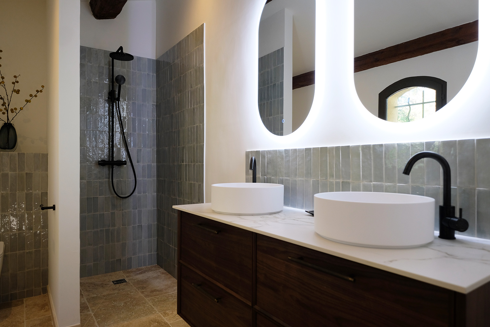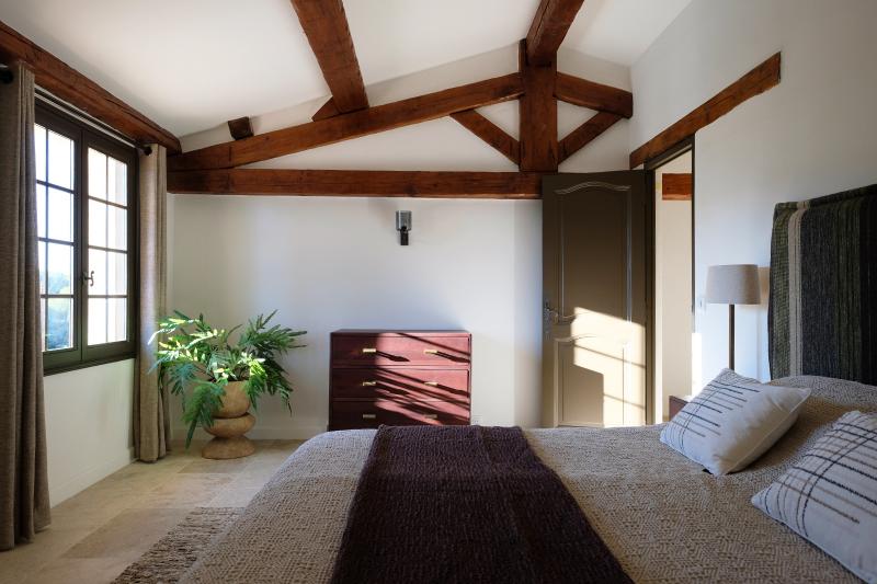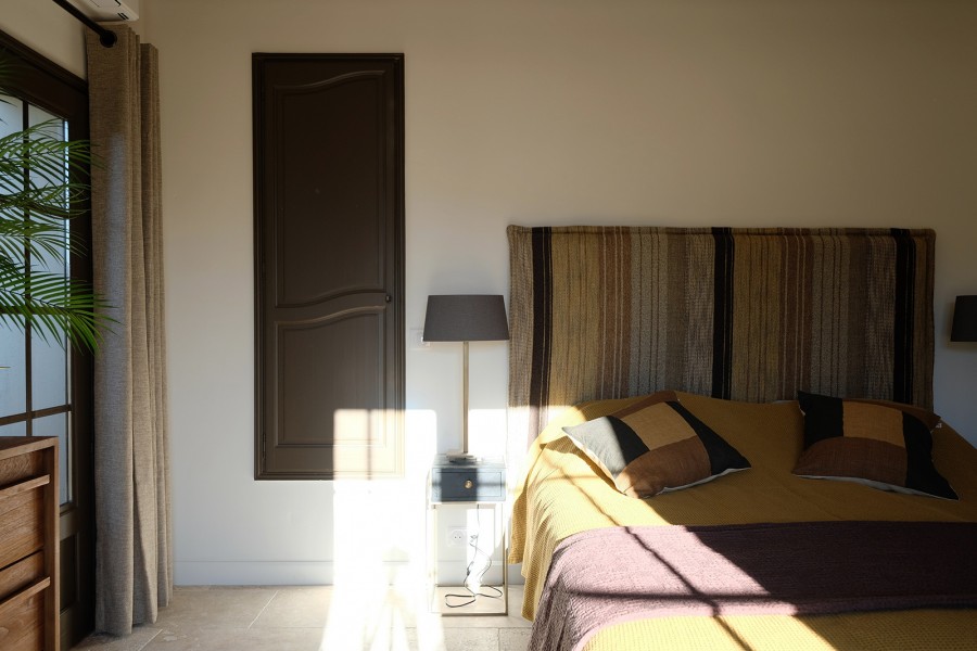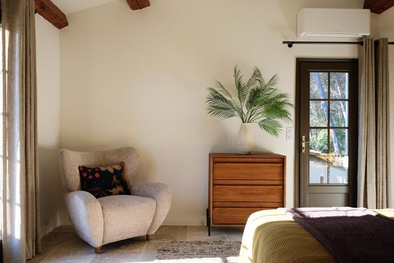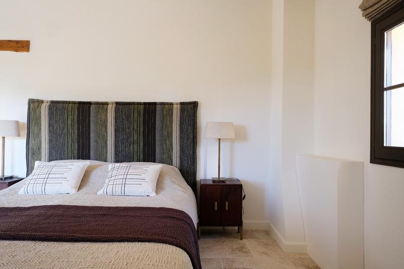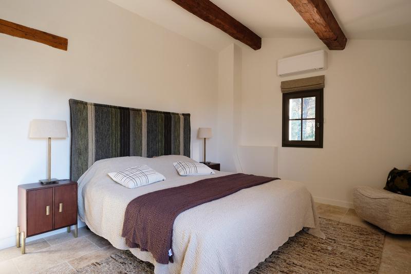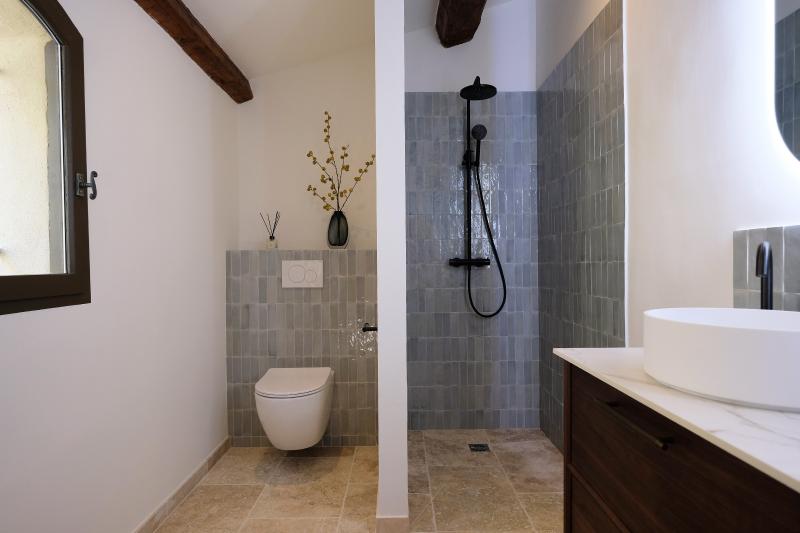 Schlafzimmer 2, im ersten Stock, bietet ein Doppelbett (2x90x200) und guten Stauraum, mit Blick auf die provenzalischen Hügel. Schlafzimmer 2 teilt sich ein luxuriöses Badezimmer mit Schlafzimmer 3 im Flur, mit Doppelwaschbecken, begehbarer Dusche und WC. Klimaanlage ist vorhanden.