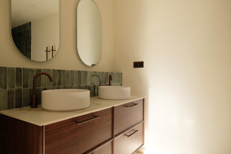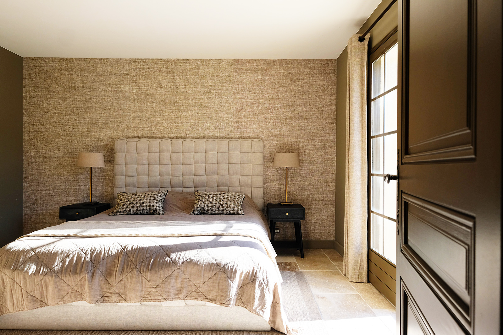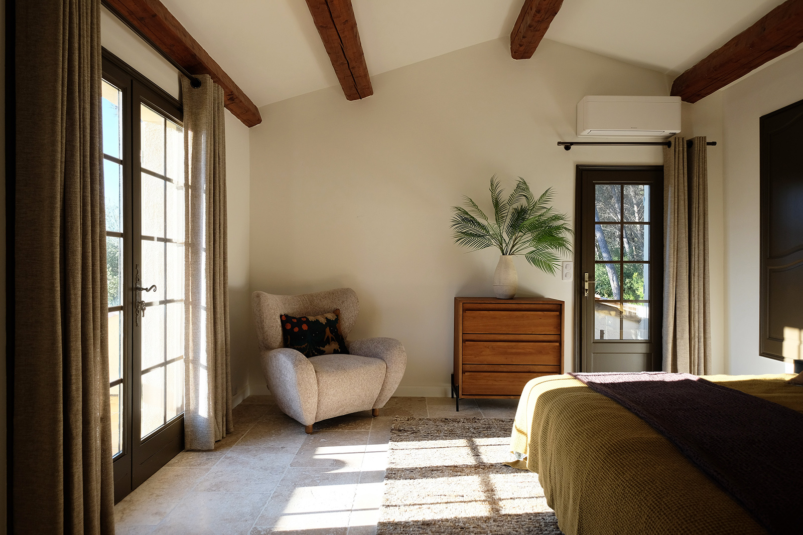 Schlafzimmer 2, im ersten Stock, bietet ein Doppelbett (2x90x200) und guten Stauraum, mit Blick auf die provenzalischen Hügel. Schlafzimmer 2 teilt sich ein luxuriöses Badezimmer mit Schlafzimmer 3 im Flur, mit Doppelwaschbecken, begehbarer Dusche und WC. Klimaanlage ist vorhanden.