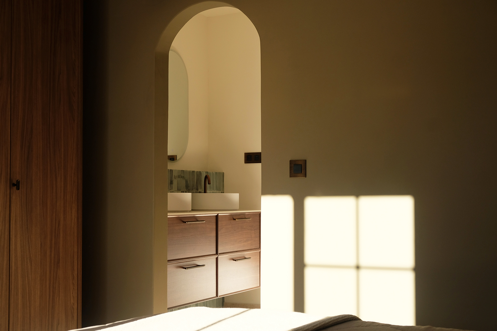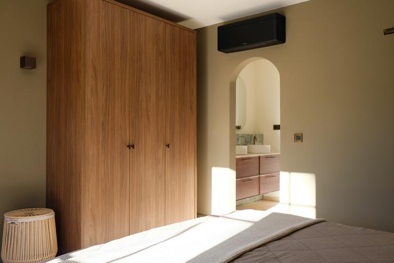 Schlafzimmer 1, im Erdgeschoss, das Elternschlafzimmer mit Doppelbett (180x200). Das en-suite Badezimmer bietet ein Doppelwaschbecken, eine begehbare Dusche und ein WC. Vom Schlafzimmer aus haben Sie Zugang zur Terrasse auf der Poolseite. Das Schlafzimmer ist mit Klimaanlage ausgestattet.