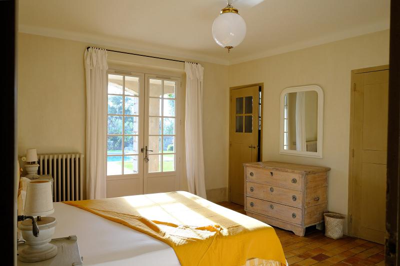 Vom Esszimmer und der Küche im Erdgeschoss gelangt man in den Garten und den Pool. Auf beiden Seiten der zweiten überdachten Terrasse, die von den Schlafzimmern im Erdgeschoss aus zugänglich ist, befinden sich Sitzgelegenheiten mit Blick auf den Pool.