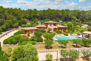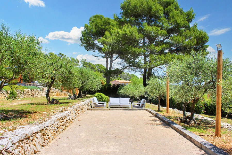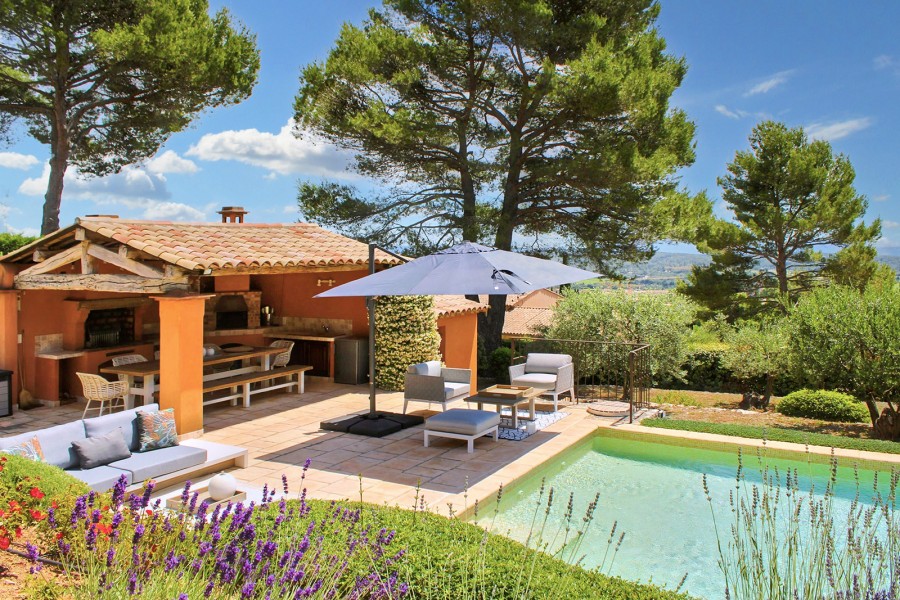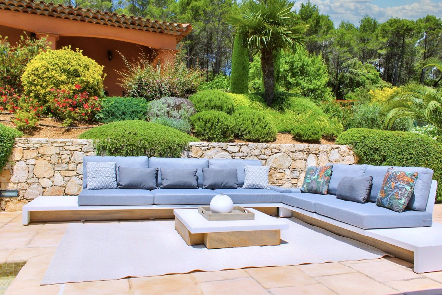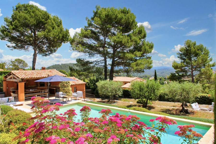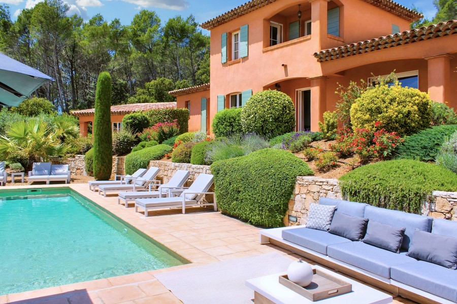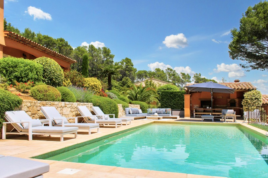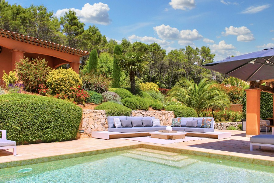 Hier dreht sich alles um das Leben im Freien: eine angenehme, überdachte Terrasse, die direkt mit Küche und Wohnbereich verbunden ist. Highlight sind jedoch der große Pool und das Poolhouse mit hochwertigen Lounge-Sets, Sonnenliegen und Sonnenschirmen.