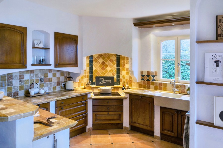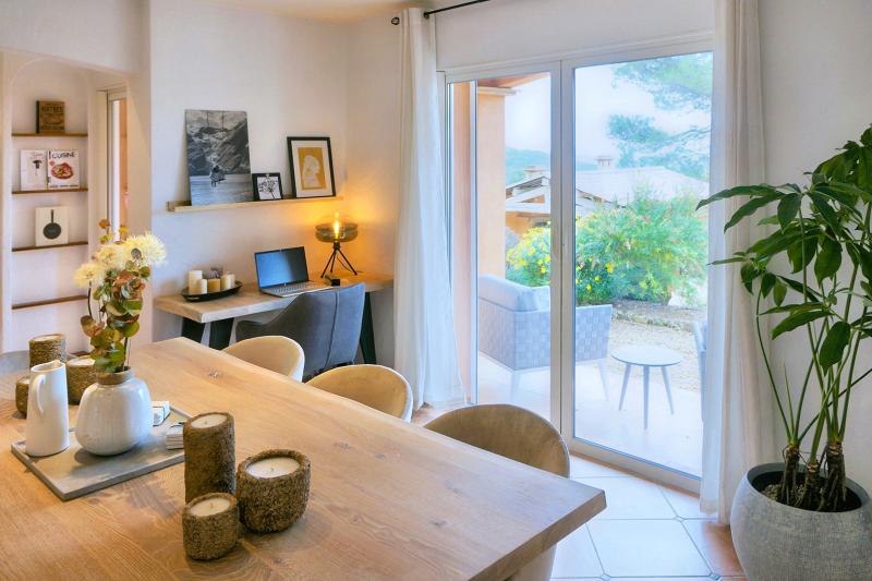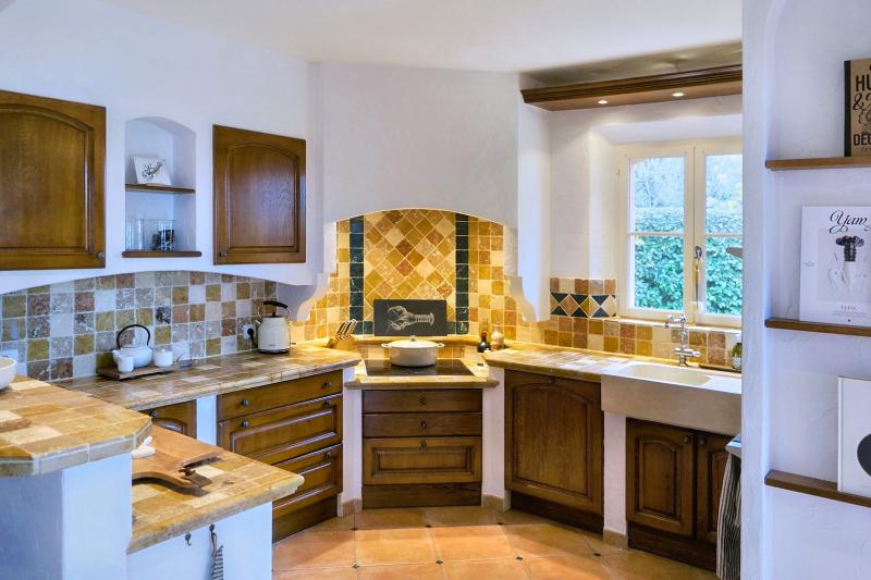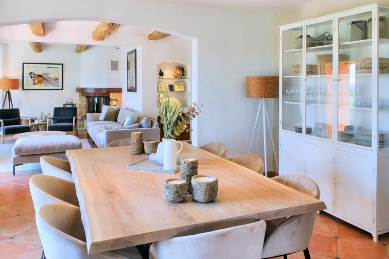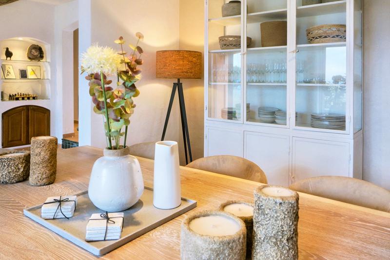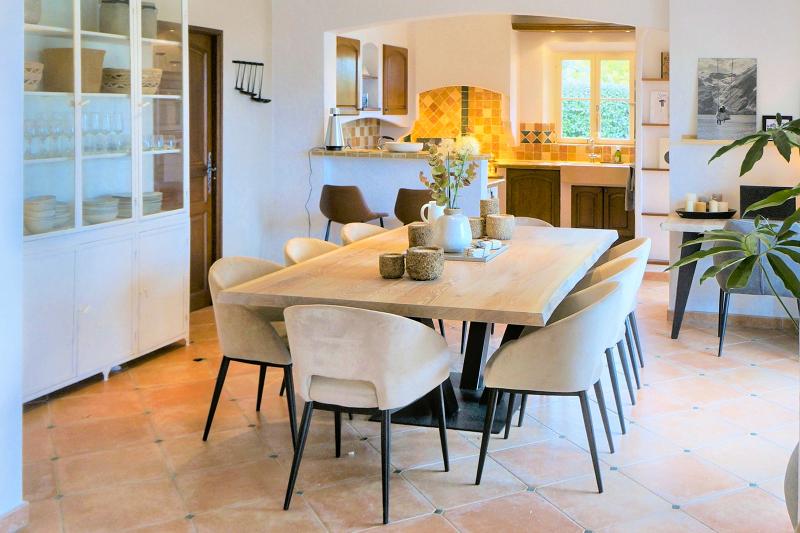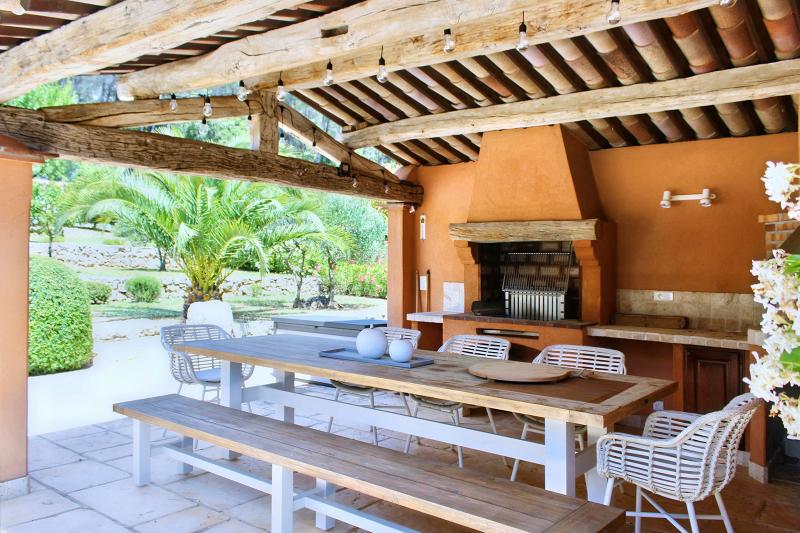 Der große Esstisch im Poolhouse bietet viel Platz für lange, gesellige Mahlzeiten, und in der komplett ausgestatteten Sommerküche wird Kochen und Essen im Freien zum Vergnügen.