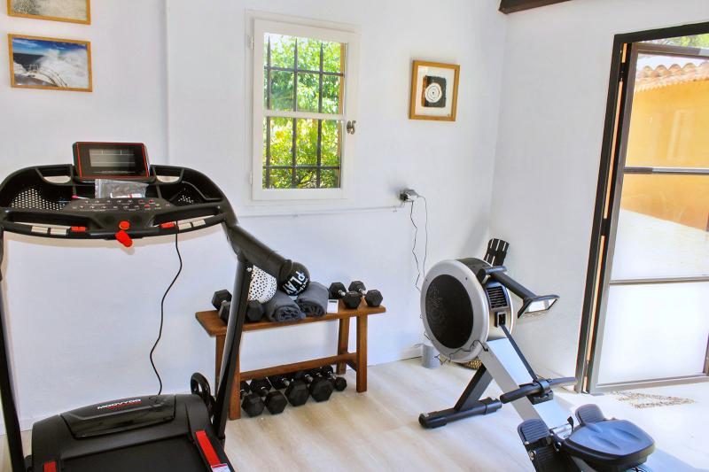 Ebenfalls praktisch ist das (kleine) separate Fitnessstudio auf der Rückseite der Villa neben dem Carport.