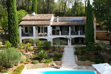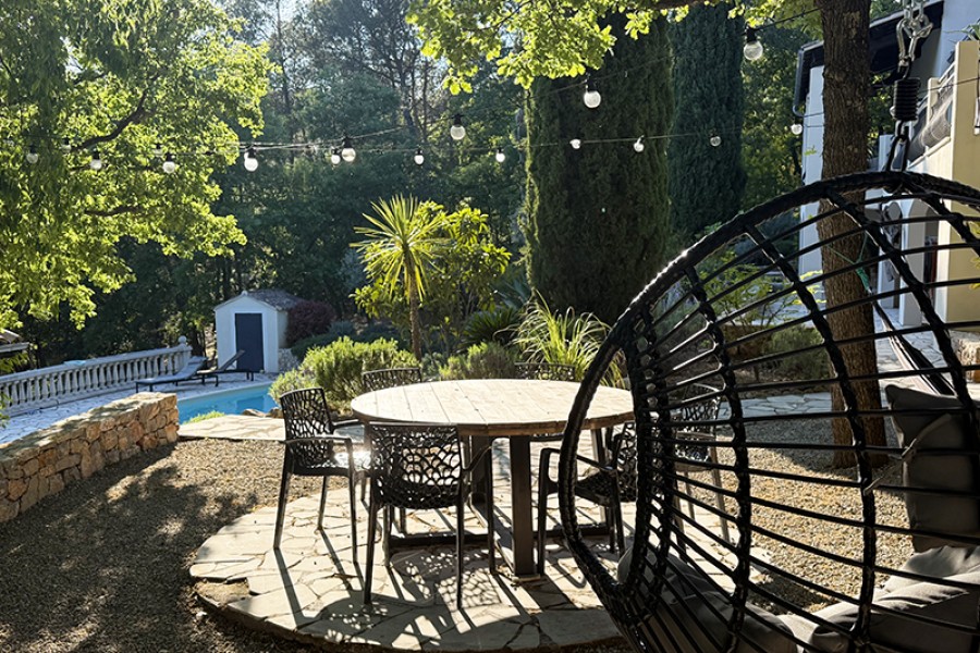 Vom Wohnzimmer aus gelangen Sie durch Flügeltüren auf die großzügige Veranda, auf der verschiedene gemütliche Sitzbereiche eingerichtet wurden. Es gibt einen Außenkamin und einen großen Esstisch, von dem aus Sie eine wunderbare Aussicht auf den Pool und die umliegenden provenzalischen Hügel genießen. Vom Wohnbereich führt eine kleine Stufe zum Essbereich und zur Küche. XXXDie moderne offene Küche wurde kürzlich renoviert und ist vollständig ausgestattet – unter anderem mit einem 'Lacanche'-Herd mit Elektro- und Gasofen, einer Plancha, zwei Kühlschränken, einem Weinklimaschrank, einer Spülmaschine, einer Nespresso-Maschine und einem Milchaufschäumer.