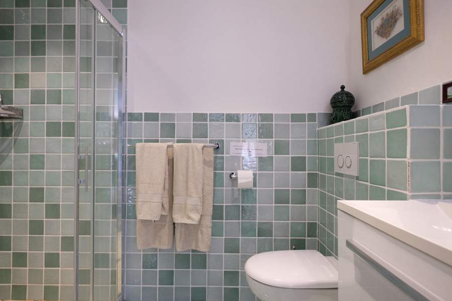 Schlafzimmer 1 (Erdgeschoss) – Ein großzügiges, stimmungsvolles und romantisches Zimmer mit Doppelbett (180x200). Das en-suite Badezimmer verfügt über eine Dusche, Doppelwaschbecken und WC.