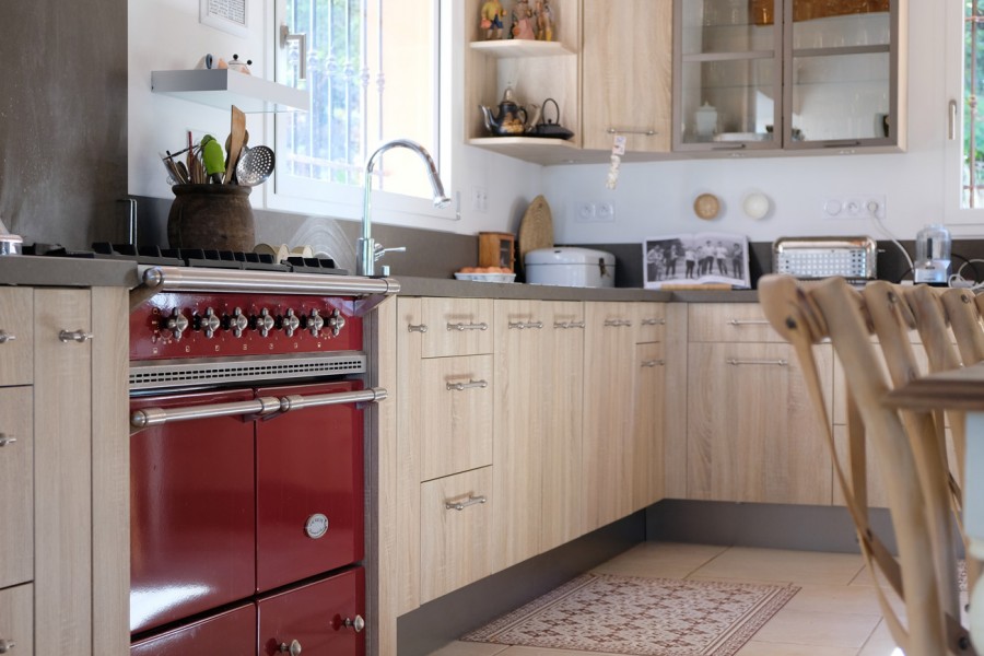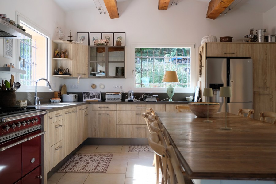 Die Küche ist eine echte Wohnküche mit dem wunderschönen roten Lacanche-Herd als Blickfang. Am großen Esstisch finden bis zu zehn Personen Platz. Die Küche ist sehr gut ausgestattet mit modernen Geräten und allem, was man zum Kochen und für gemütliche Abendessen benötigt.
