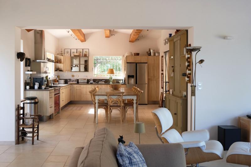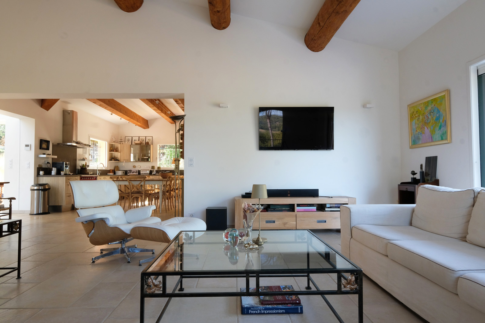 Die Einrichtung ist stilvoll und stimmungsvoll, mit der großen Wohnküche als Herz des Hauses. Daran schließt sich das gemütliche Wohnzimmer mit mehreren bequemen Sofas an – ein herrlicher Ort zum Entspannen. Dank des Highspeed-Glasfaserinternets ist die Villa auch ideal für Gäste, die gelegentlich aus der Ferne arbeiten möchten.