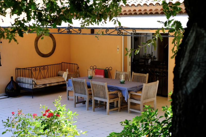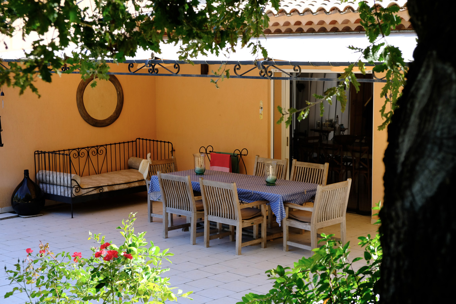 Vom Wohnzimmer aus gelangen Sie direkt auf die Terrasse und in den Garten. Die Küche bietet zudem direkten Zugang zur überdachten Terrasse mit Esstisch – ideal für gemeinsame Mahlzeiten im Schatten.