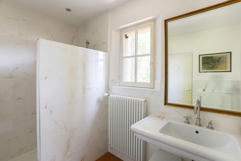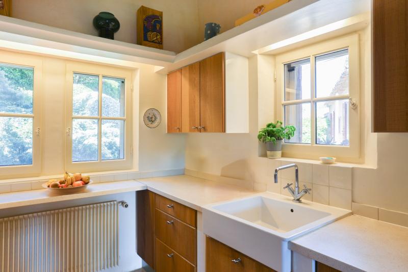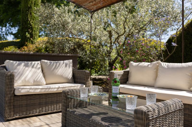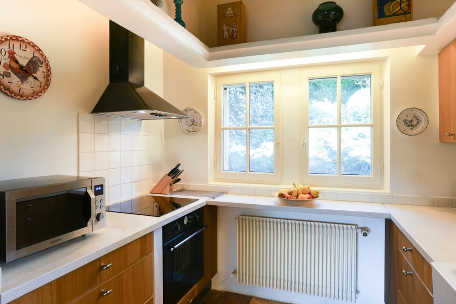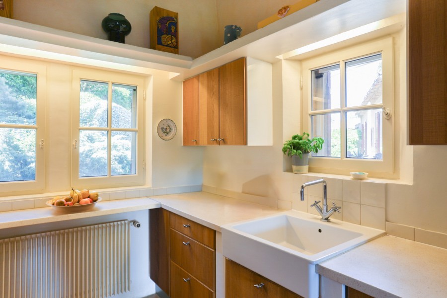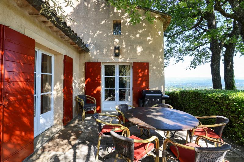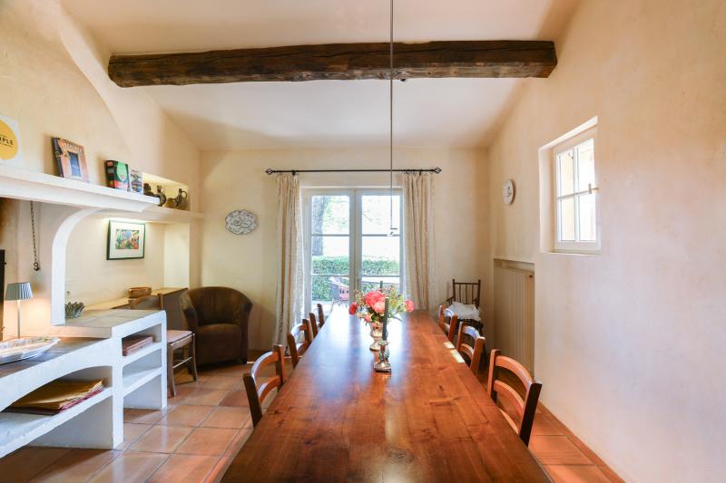Vom Flur aus gelangen Sie in den geräumigen Esszimmer- und Küchenbereich. Dort finden Sie einen langen Tisch mit 8 Stühlen. Die Küche ist voll ausgestattet (Kühlschrank, Herd, Elektroofen, Geschirrspüler, Toaster, Kaffeemaschine). Mehrere elektrische Werkzeuge eignen sich gut zur Zubereitung guter Mahlzeiten. In einer separaten Speisekammer befindet sich ein zweiter Kühlschrank mit Gefrierfach. Neben dem Esszimmer befindet sich eine große, attraktive Terrasse mit einem Olivenbaum mit Blick auf das Tal (Sonnenschirm, Tisch und 8 Stühle). Von hier aus haben Sie Zugang zu einer Terrasse, die von einem Lavendelbeet umrahmt ist, und zu einer weiteren Terrasse mit Tisch und Stühlen im Schatten der Bäume.