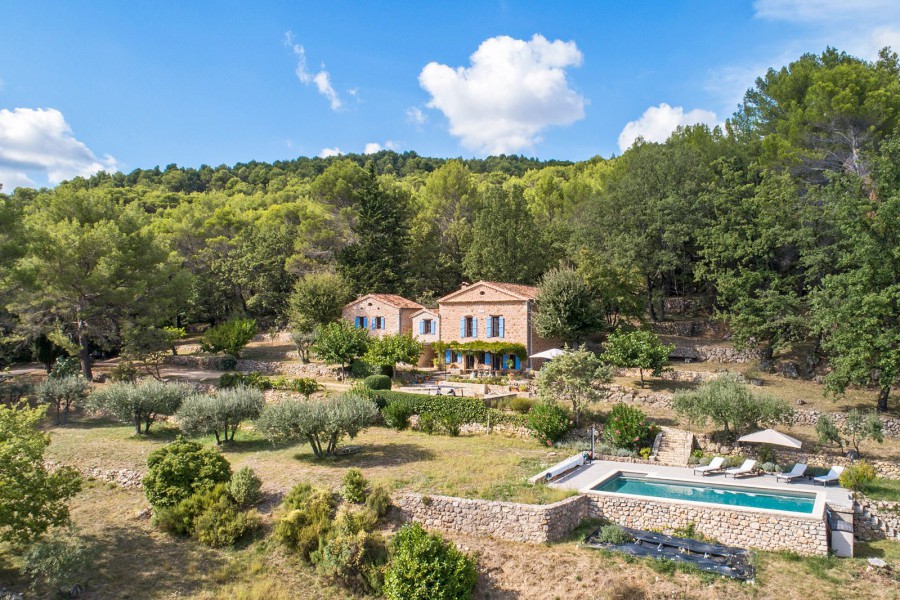Von Seillans fahren Sie in circa 5 Minuten zwischen den Wäldern zu der Bastide. Das letzte Stück führt über die eigene Auffahrt zwischen Bäumen und den Natursteinen 'restangues' zu der Bastide. Die Terrasse vor der Bastide ist bestückt mit Blumen und Pflanzen in Beeten und Töpfen. Auf der Terrasse vor dem Haus...