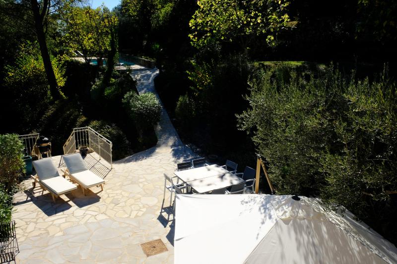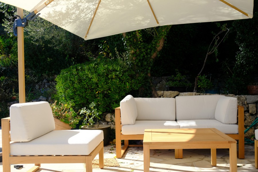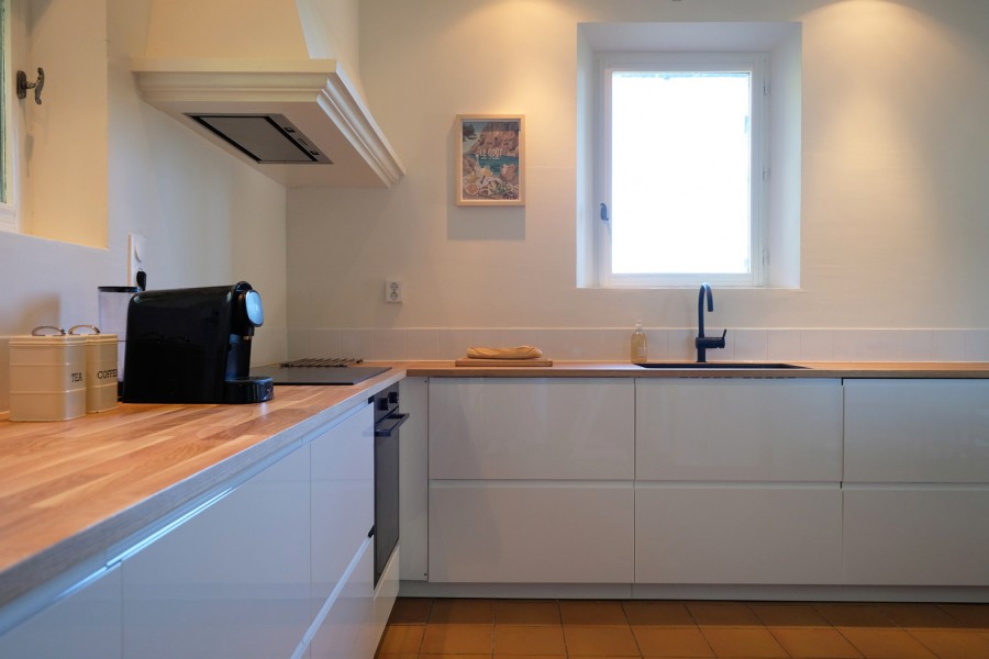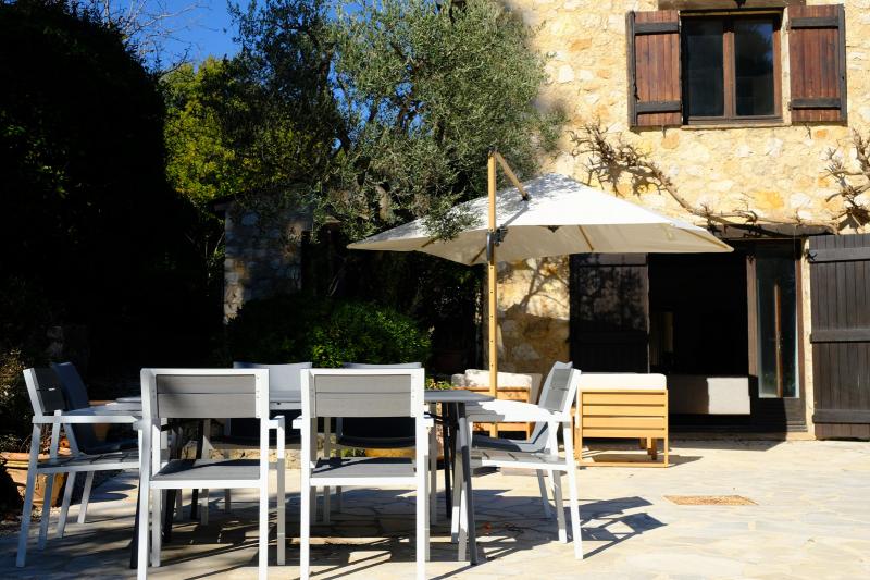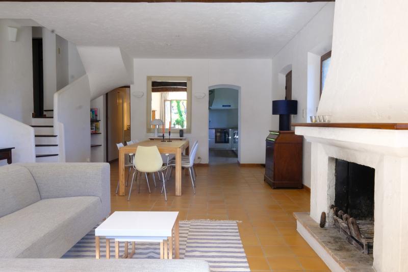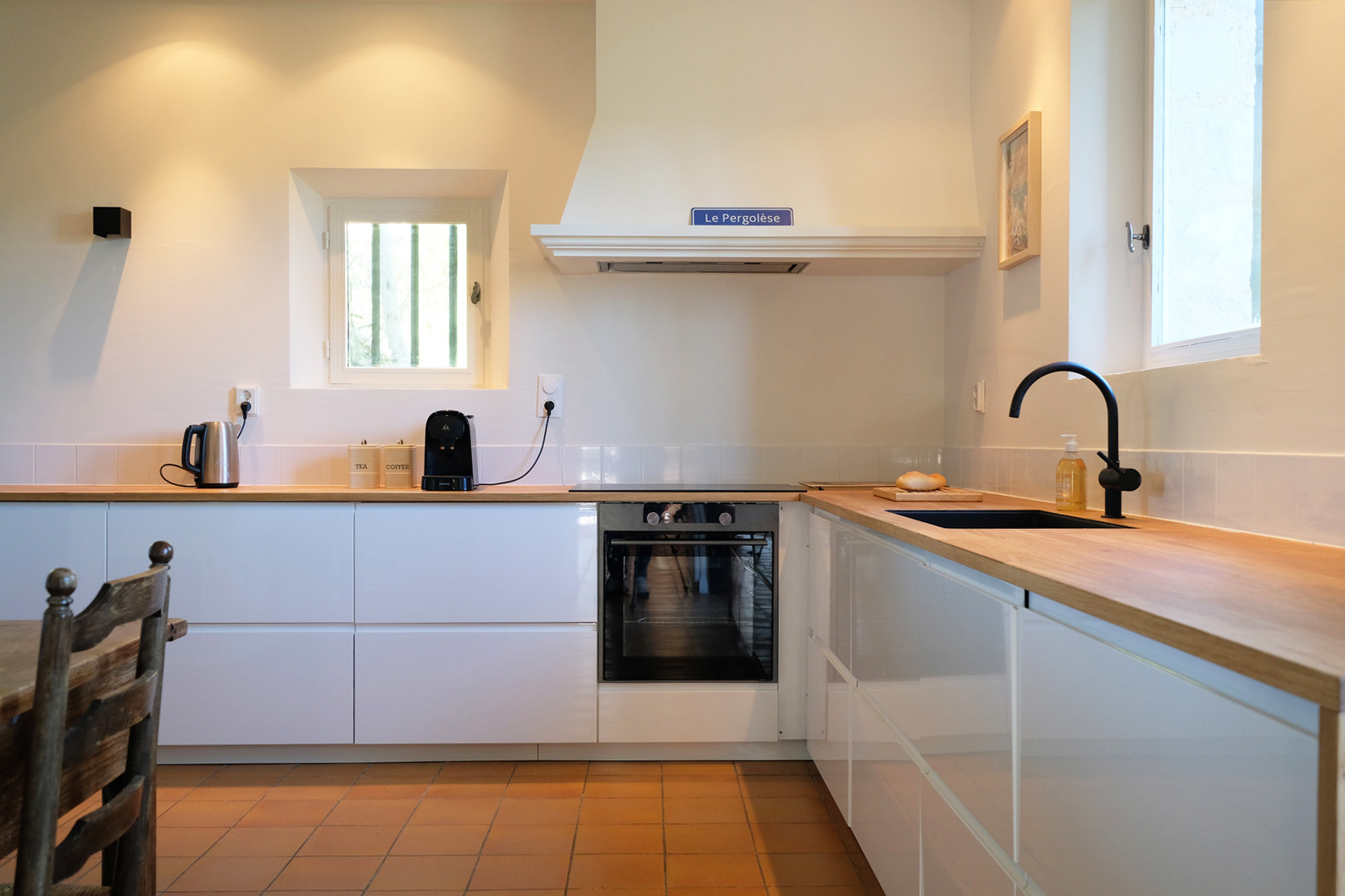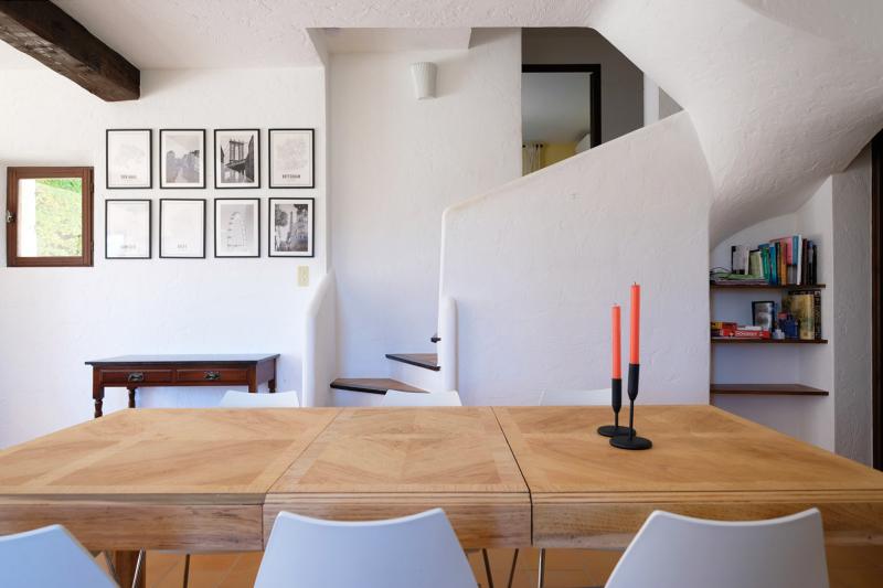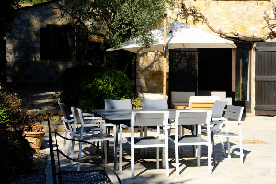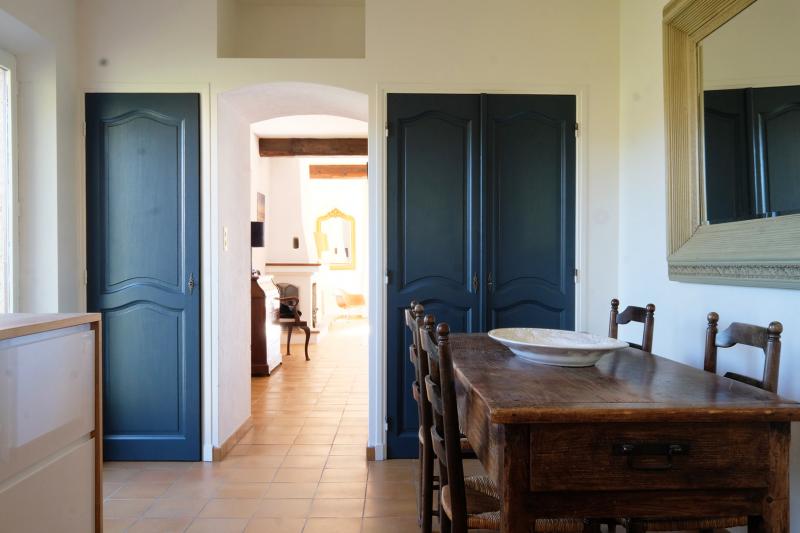 Der Esstisch ist großzügig und bietet auf Wunsch Platz für bis zu acht Personen. Die moderne Küche ist komplett ausgestattet und verfügt über Geschirrspüler, Heißluftofen, Induktionskochfeld und Mikrowelle. Ein charmant alter provenzalischer Holztisch mit vier Stühlen verleiht dem Raum zusätzlichen Charakter.
