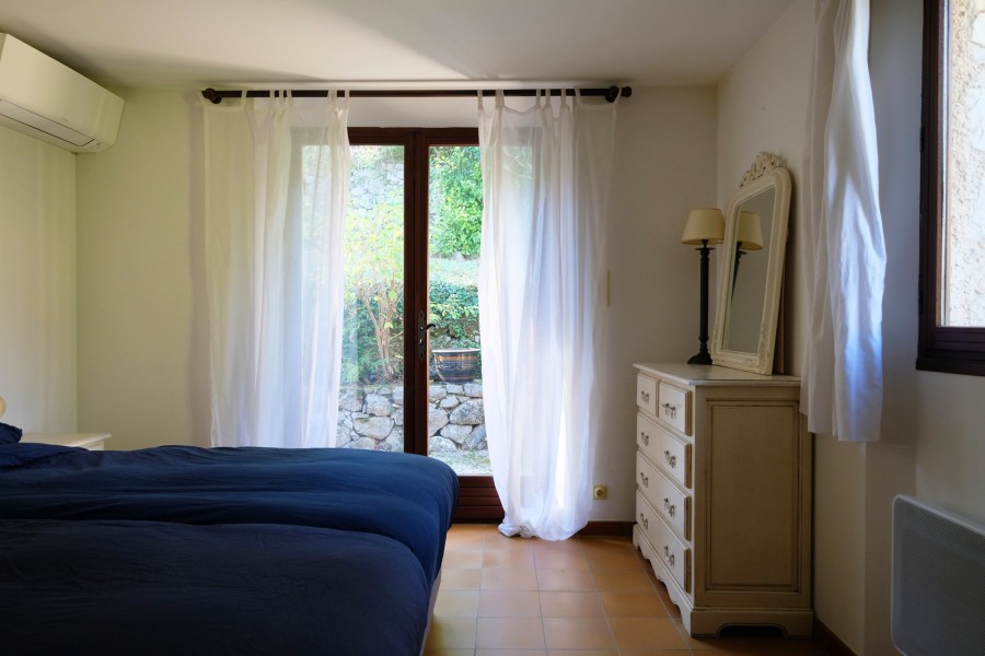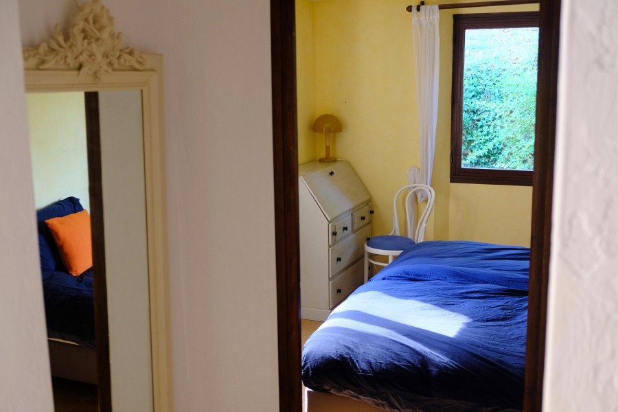 Schlafzimmer 2 befindet sich ebenfalls im ersten Stock, auf der anderen Seite des Badezimmers. Das Bett ist ein Doppelbett (180x200). Dieses geräumige Schlafzimmer bietet Zugang zu einer kleinen Terrasse an der Seite des Hauses. Schlafzimmer 2 teilt sich ein Badezimmer (Dusche, Badewanne und Waschbecken) mit Schlafzimmer 1.