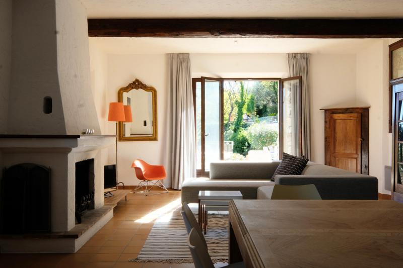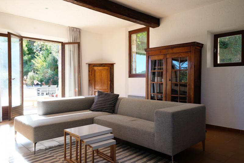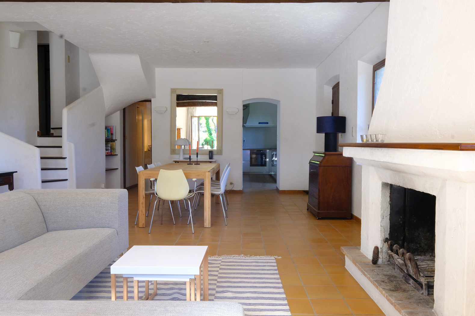 Das Wohnzimmer vereint auf harmonische Weise authentische Holzbalken, weiß verputzte Wände und modernes Mobiliar, mit einem schönen Kamin als Blickfang. Glasfaserinternet ist vorhanden. Durch die Flügeltüren gelangen Sie auf die angrenzende Terrasse mit großem Esstisch, Gasgrill und komfortabler Lounge-Sitzgruppe.