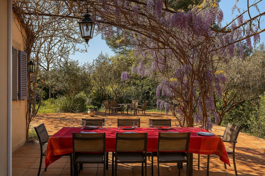 Die Villa Saurrones liegt neben dem Dorf Tourrettes im Kanton Fayence, im Departement VAR (Provence - Cote d'Azur). Tourrettes ist nur 30 Autominuten von der mondänen Stadt Cannes und Antibes an der Cote d'Azur und 45 Minuten vom Flughafen Nizza entfernt. Tourrettes liegt neben dem beliebten Dorf Fayence, bekannt für seine Geschäfte, Restaurants und seinen provenzalischen Markt, dreimal pro Woche. Tourrettes ist nur ca. 15 Minuten zu Fuß von der Villa entfernt und bietet eine permanente Open-Art-Ausstellung, ein mittelalterliches Schloss und Dorf, einige schöne Geschäfte, ein paar Restaurants, eine Weinbar und einen atemberaubenden provenzalischen Platz mit Platanenbäumen.