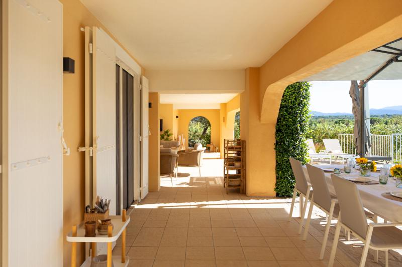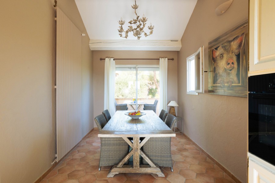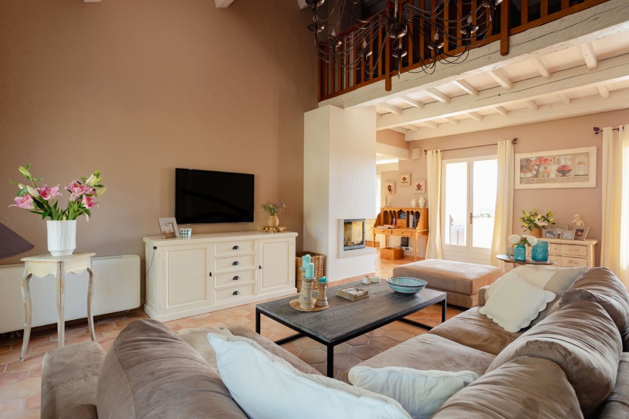 Die Villa ist mit ihren 330 m2 Wohnfläche großzügig. Das Wohnzimmer ist gemütlich mit komfortablen Möbeln im Landhausstil eingerichtet. Durch französische Türen gelangen Sie auf die teilweise überdachte Terrasse in der 1. Auf diese Weise können Sie den weiten Blick über die Weinberge und die...